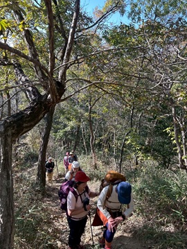 当日は雲一つない快晴で、集合時は肌寒さを感じましたが、歩き始めると徐々に 暖かくなり、登山口では汗ばむほどの陽気となりました。 昼食場所には予定より早く到着できましたが、昼食後は岩場や急斜面の アップダウンが続き、徐々にペースが落ちていきました。 下山時点では予定より少し遅れての到着となり、一本遅い電車で帰路につきました。 ソフトな内容ではありましたが、変化に富んだコースで、山行部として充実した例会と なりました。ご参加いただいた皆様、誠にありがとうございました。 なお、今回は視覚障害者の方から8名の参加申し込みがありましたが、サポート体制 が整わず、半数以上の方に参加を見送っていただくこととなりました。 誠に申し訳ございませんでした。 コースリーダーのOさん、サブリーダーのHさん、充実した例会の実施にご尽力いただき、 心より感謝申し上げます。 |