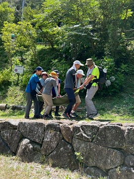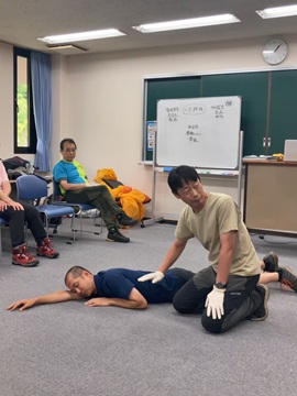 【12日(土)】9:30〜16:30 午前:後ろサポート方法歩き方講習 午後:屋内での救急法の実施(研修室) ・事故やケガ、病気が発生した時の状況評価から 一次評価 ・救助要請、脊椎損傷があり得る場合の体位変換方法 ・大出血時のコントロール 呼吸困難の疑似体験 ・手首捻挫(ペットボトルで固定) 〜講習終了後、懇親会(バーベキュー)〜 【13日(日)】9:00〜12:00 ・不規則な石段でのサポート講習 ・シートを使った搬送方法 ・ロープを使った川の渡渉 〜講習終了後、各自持参した非常食(α米など)で昼食〜 |